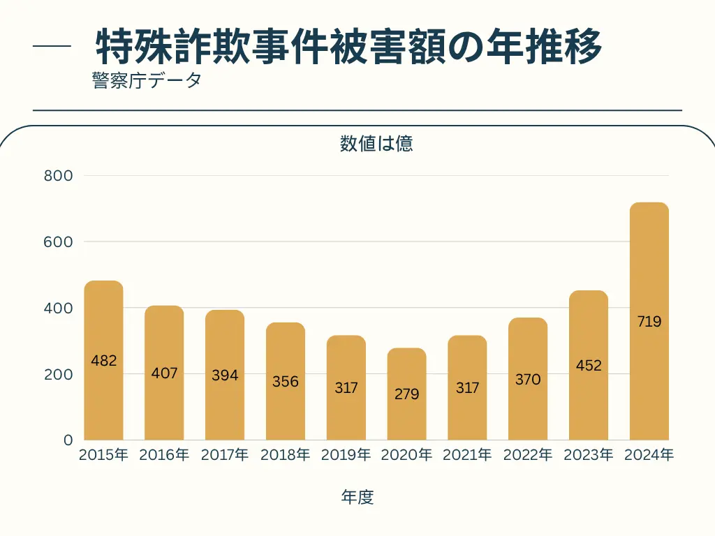 警察庁の統計によると、特殊詐欺の認知件数は一時的に減少した年もありましたが、手口の変化により再び増加傾向を示しています。